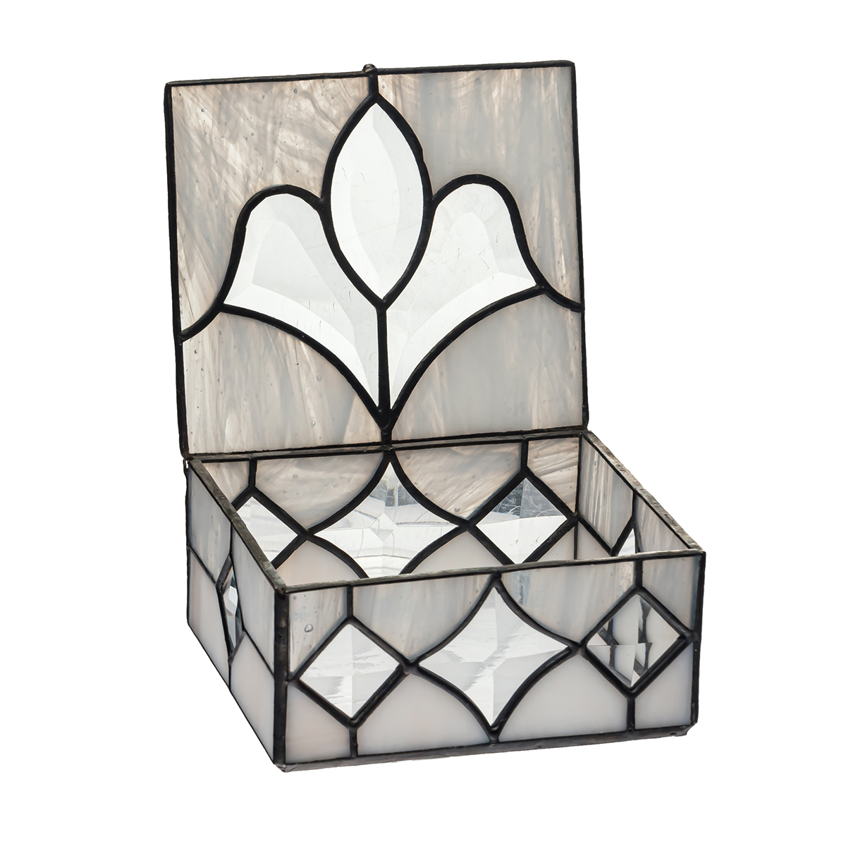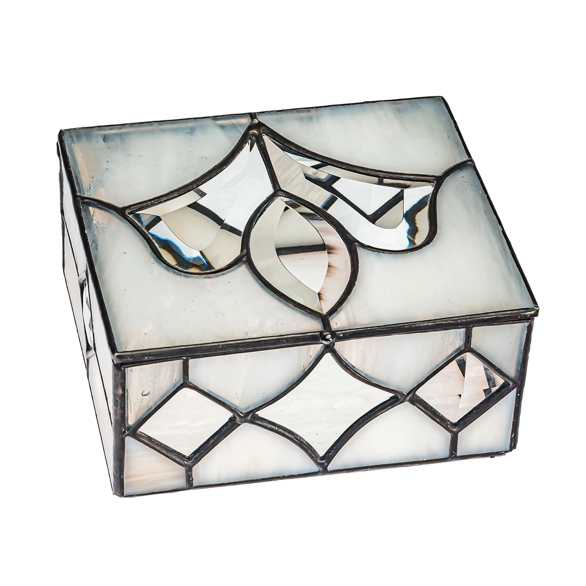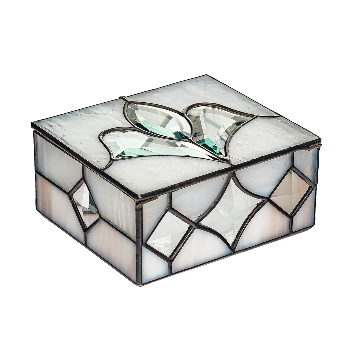 Шкатулка ручной работы из полупрозрачного опалесцированного стекла с фацетными элементами выполнена в технике тиффани.