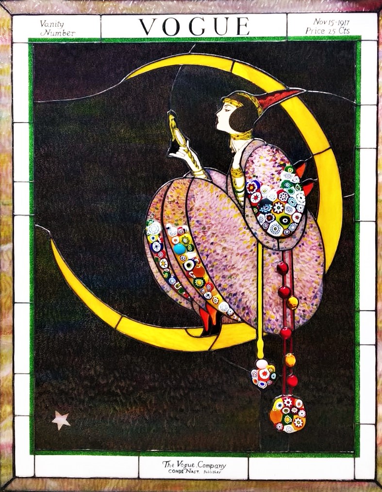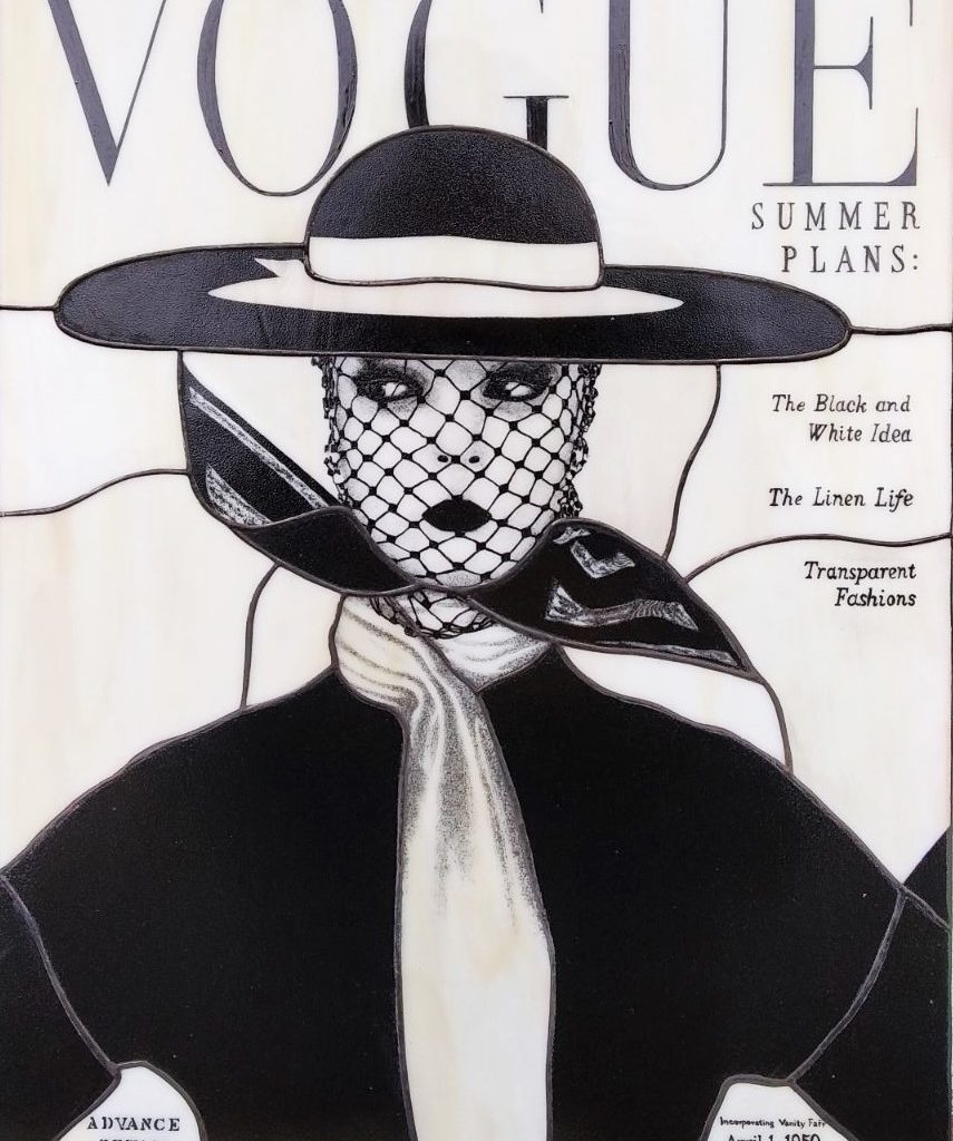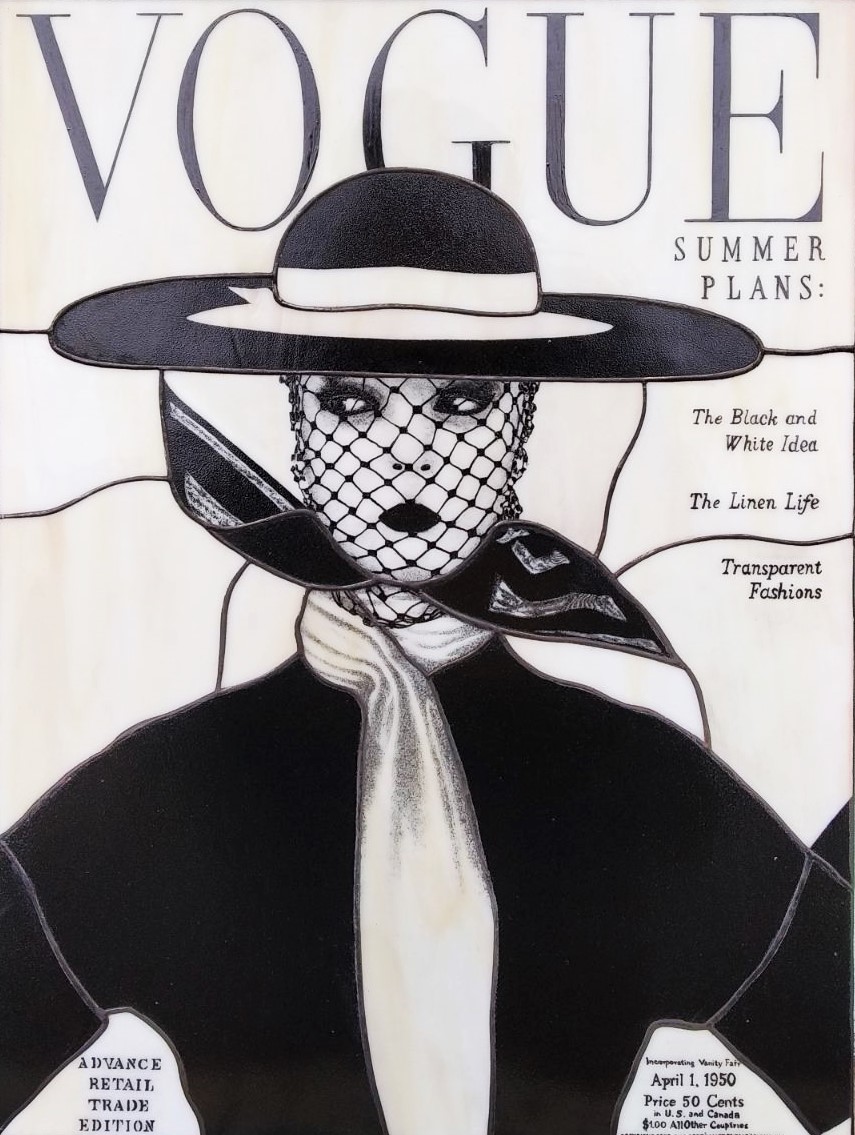 Елегантна вітражна картина 400 х 300 mm. Виконана в техніці тіффані і вітражного розпису. За основу взято зображення обкладинки американського Vogue (квітень, 1950 р). Можлива зміна сюжету, написів. Можливе виготовлення в інших розмірах.