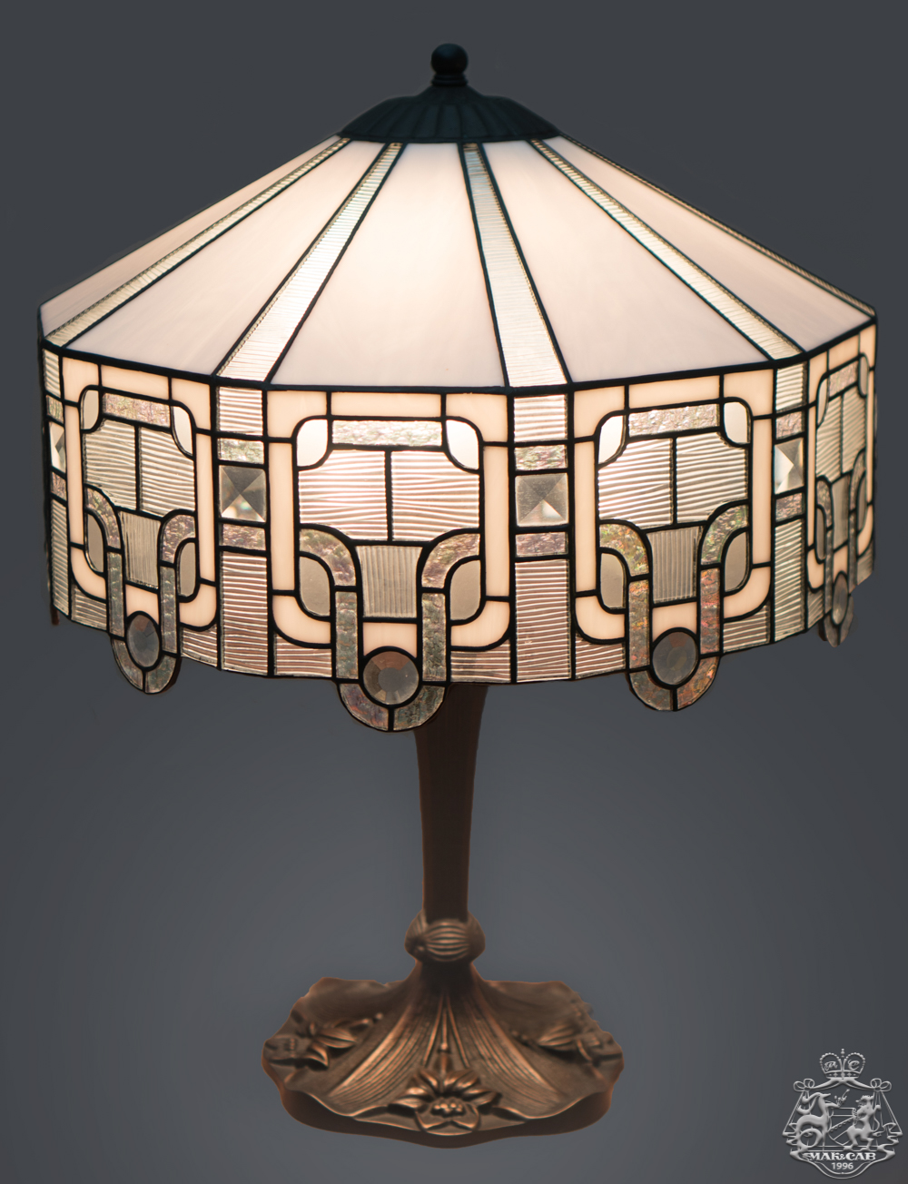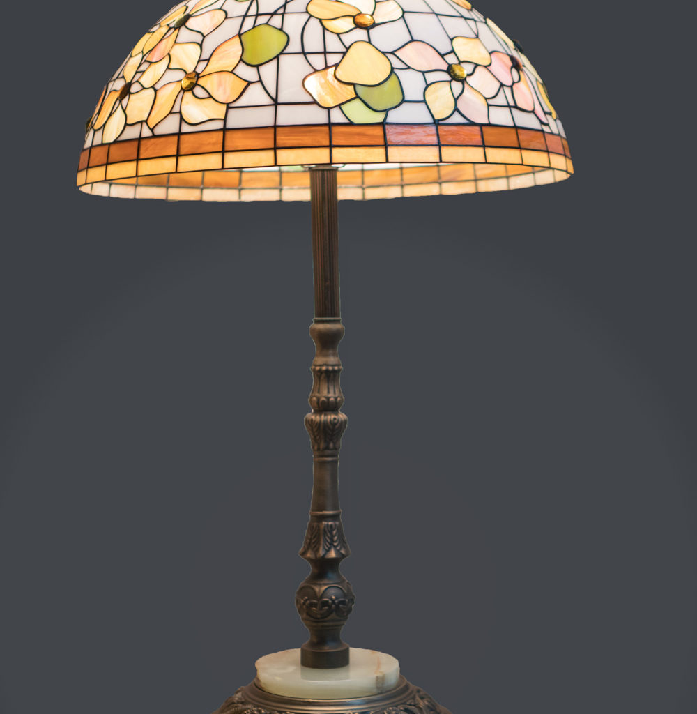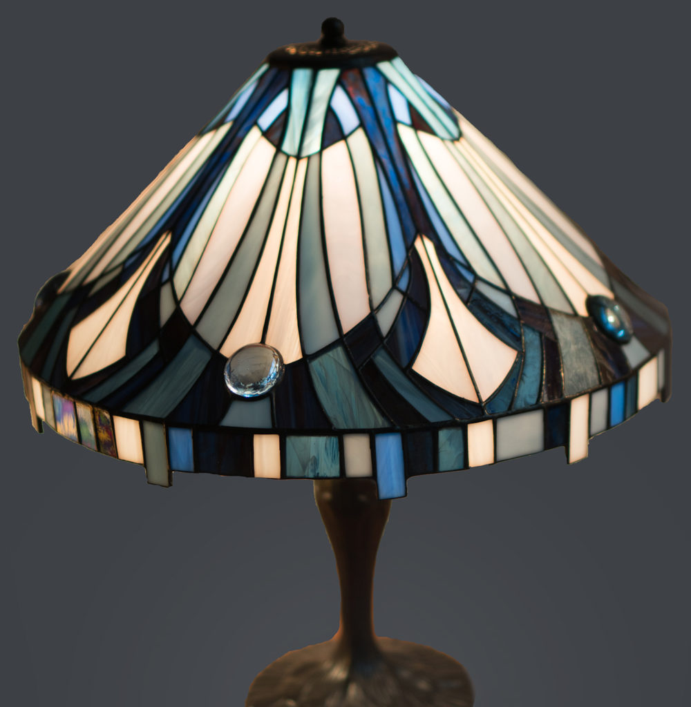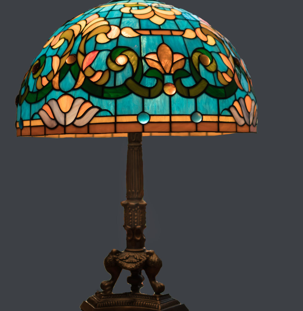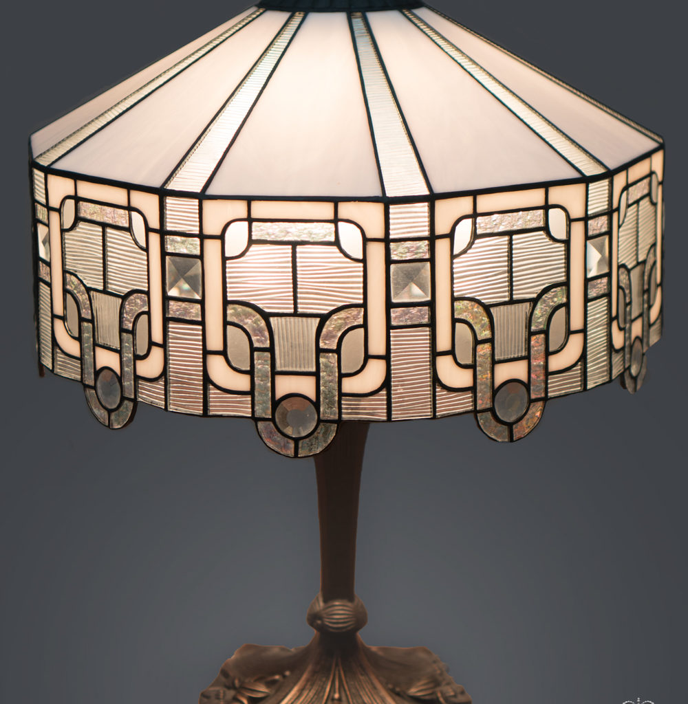 Класична лампа виконана в техніці Тіффані з використанням фацетних елементів. Поєднання кришталево прозорих, рифлених, і напівпрозорих стекол створює гру світла і додає простору надзвичайну урочистість.